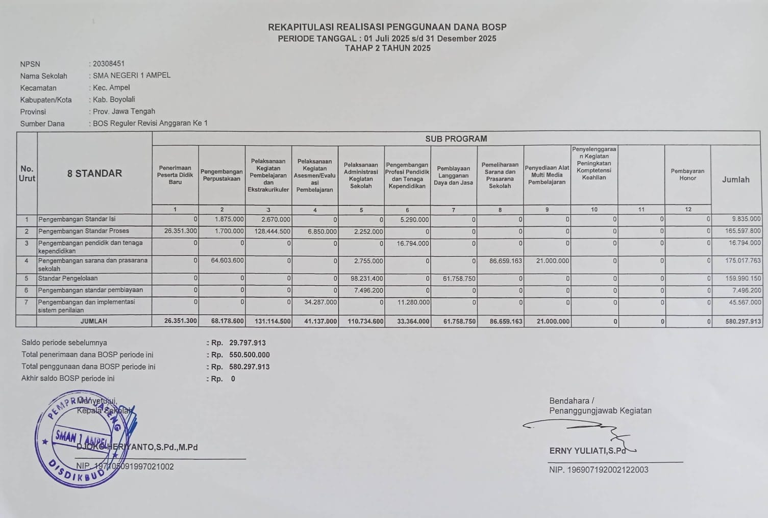 Rekapitulasi Realisasi Penggunaan Dana BOS periode 1 Juli s/d 31 Desember 2025